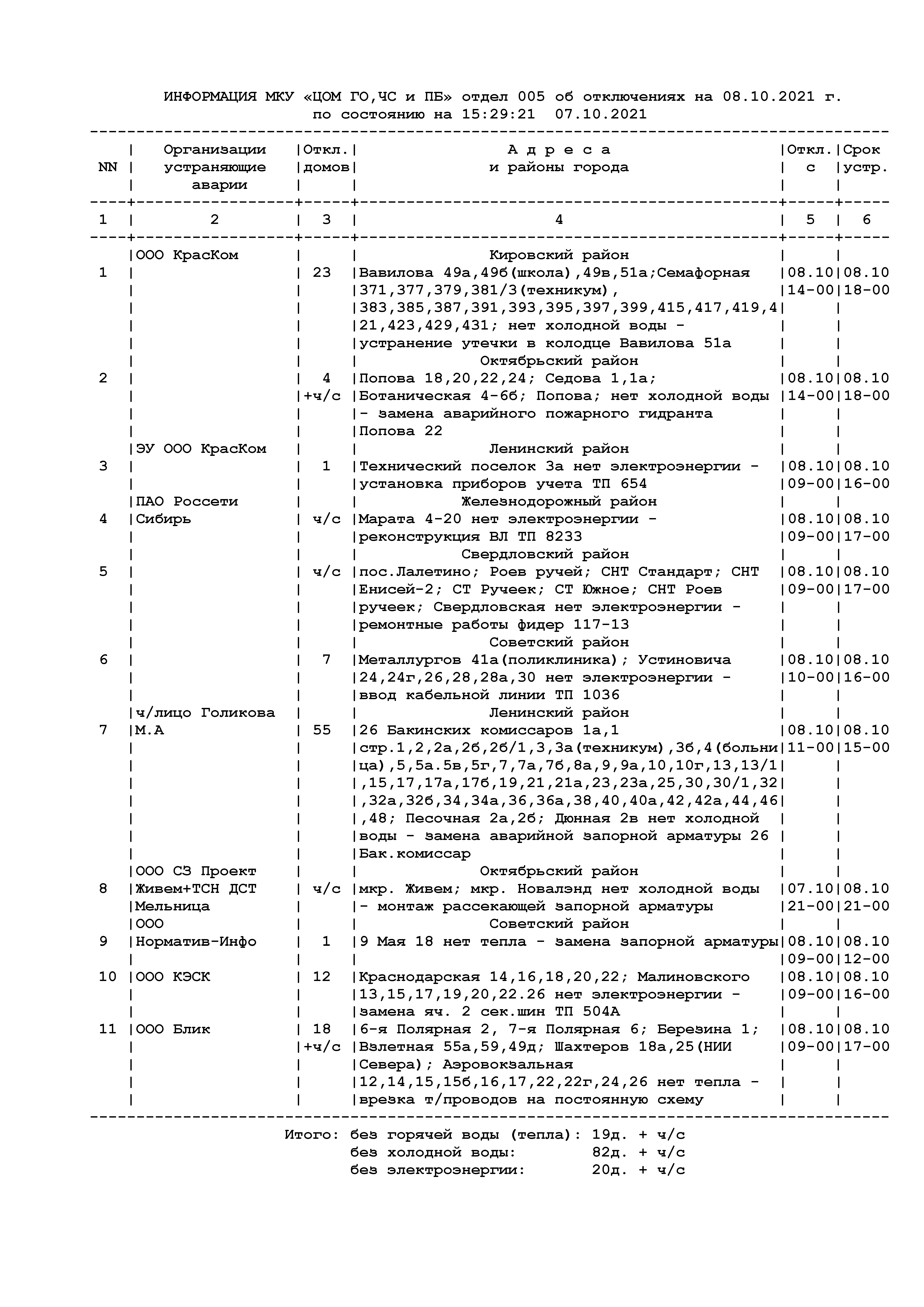 Информация об отключениях на 07.10.2021